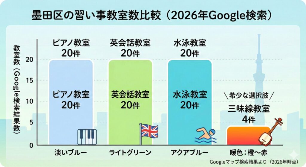 墨田区で三味線が習える教室は実際に何件あるのでしょうか。この記事ではGoogle検索とGoogleマップ検索をもとに、墨田区の三味線教室の数を調査しました。 墨田区で子どもの習い事を探すとき、 まず思い浮かぶのは ・ピアノ・英会話・水泳 ではないでしょ...