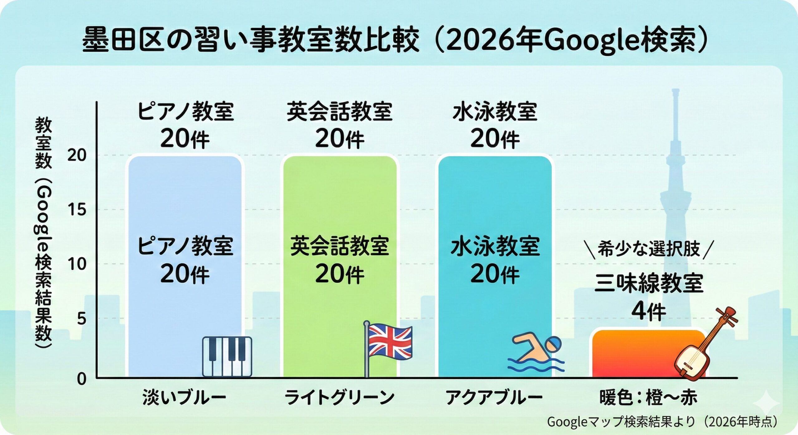 墨田区内に明確な拠点を持つ三味線教室は4件が確認できました。